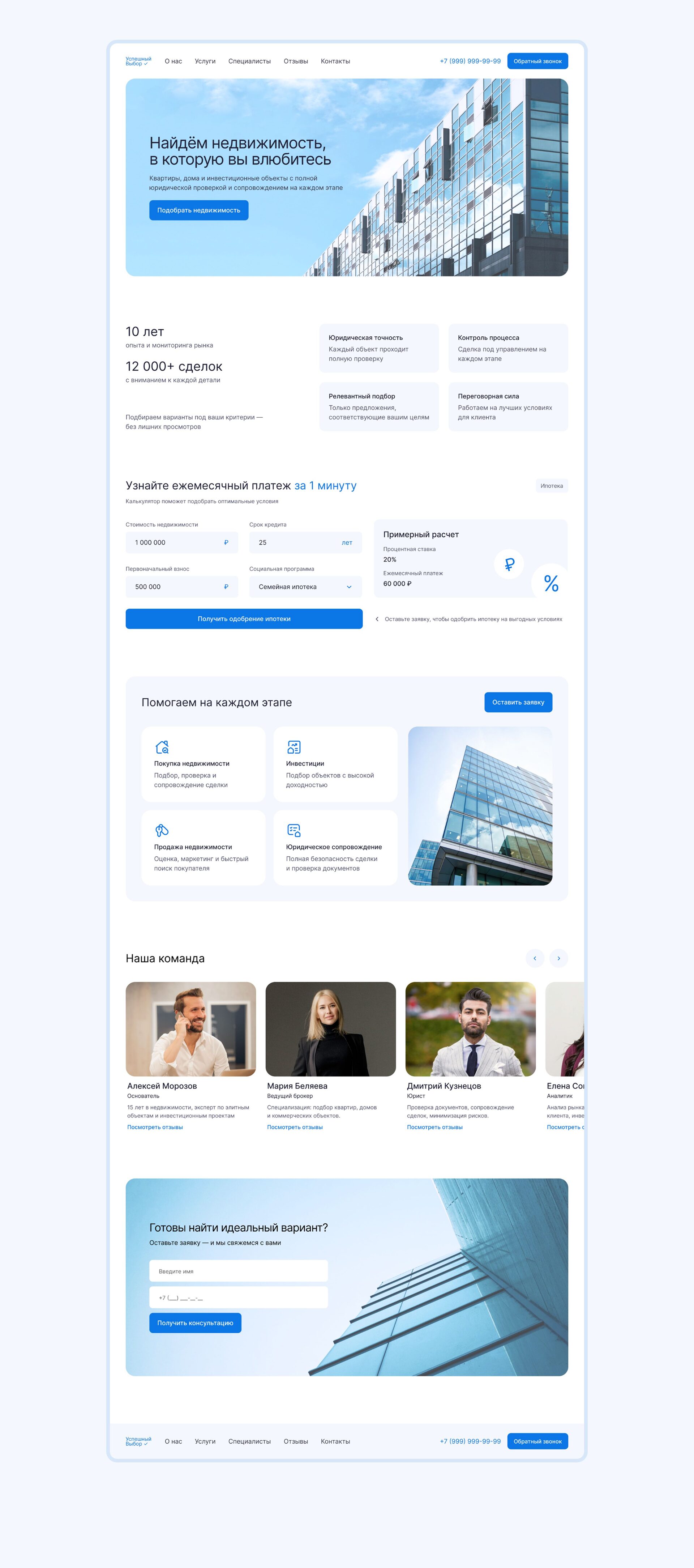 Результат: Создан структурированный и визуально чистый лендинг с акцентом на доверие и удобство пользователя.