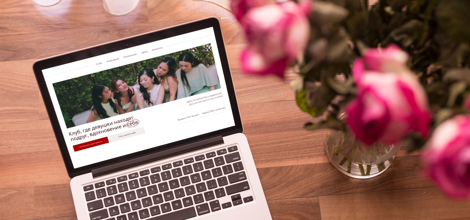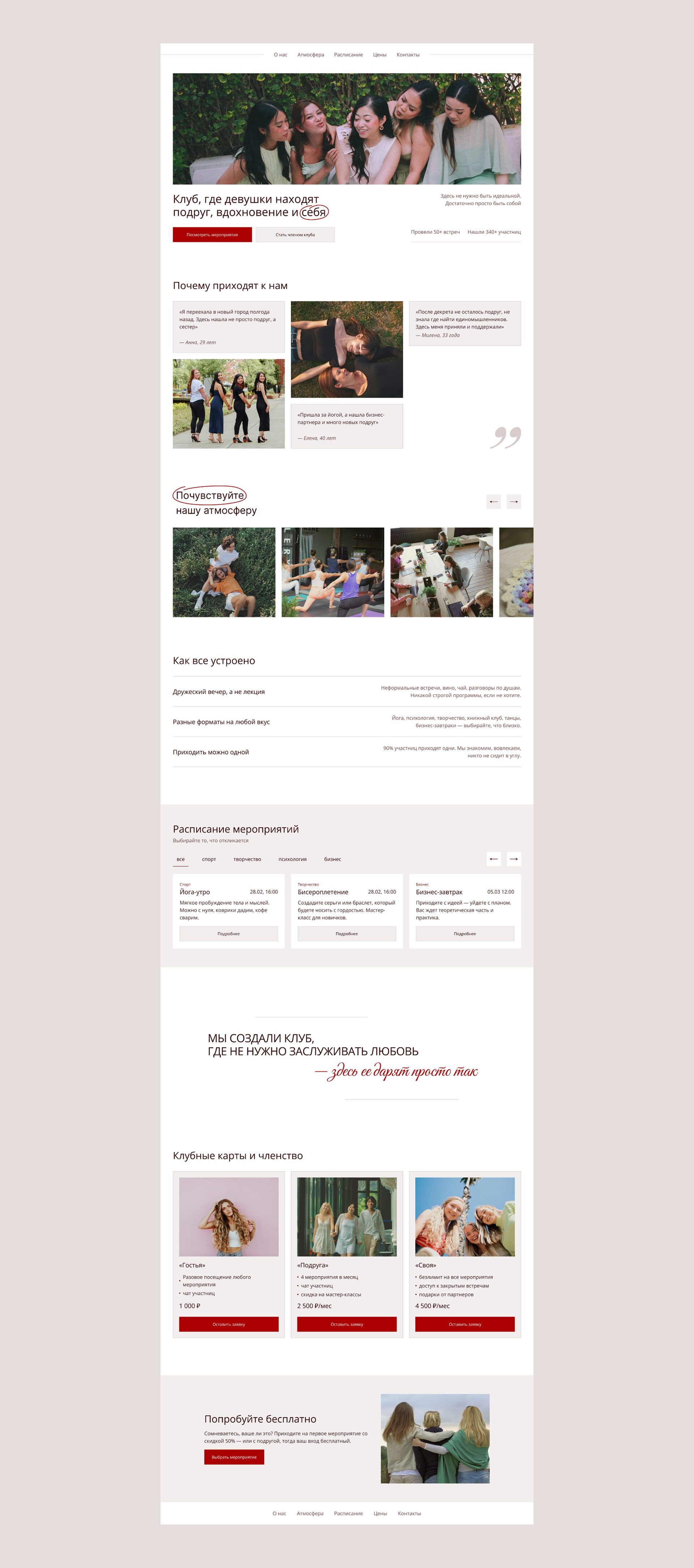 Задача: Создать атмосферный и понятный сайт для женского клуба, который будет продавать членство и билеты на мероприятия, а главное — вызывать доверие и желание прийти.